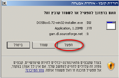 חלון הורדת הקובץ מאפשר להפעיל את התוכנה מיד עם סיום ההורדה או לחלופין לשמור את תוכנת ההתקנה בתיקייה מסויימת. בדוגמא זו אנחנו נפעיל את התוכנה מיד עם סיום ההורדה, ולכן נלחץ על "הפעל" (Run) (תמונה).