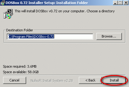 המסך הבא הוא מסך בחירת יעד ההתקנה. במסך זה ניתן לבחור את התיקייה בה DOSBox תותקן. מומלץ להשאר עם ברירת המחדל שהתוכנה מציעה וללחוץ על "Install" כדי להתחיל את תהליך ההתקנה. (תמונה).