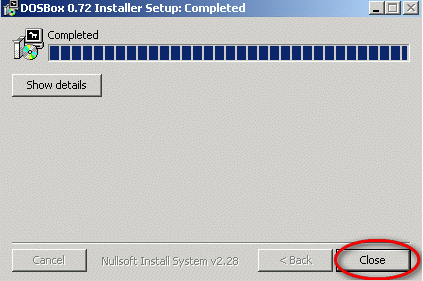 כעת תוכנת ההתקנה תתקין את DOSBox. בסיום ההתקנה יש ללחוץ על כפתור ה"Close" כדי לסגור את תוכנת ההתקנה. (תמונה).
